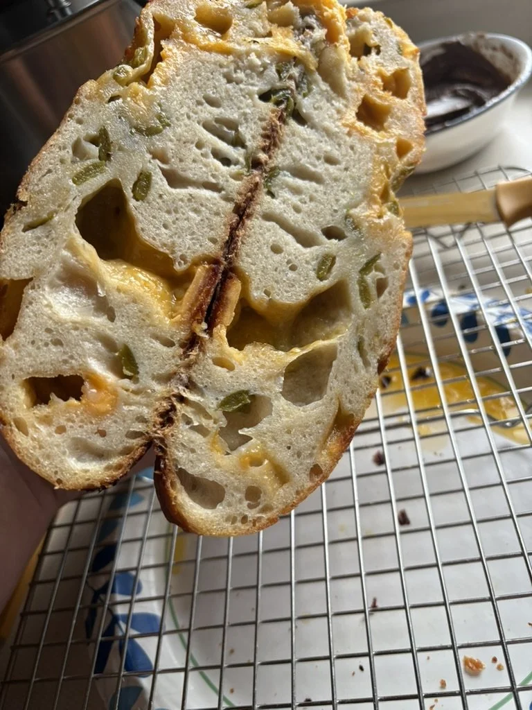 Cheddar Jalapeno savory sourdough packed with cheddar and jalapeno flavor.